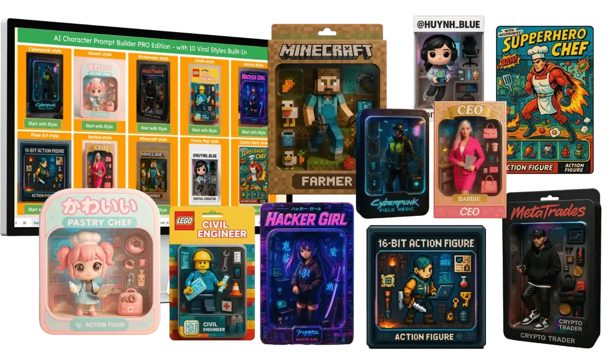 ✅ 10 New Characters: Cyberpunk, Kawaii, Streetwear, LEGO-style, Anime, Barbie, Pixel Art, Comic Hero, Funko Pop, Minecraft.
