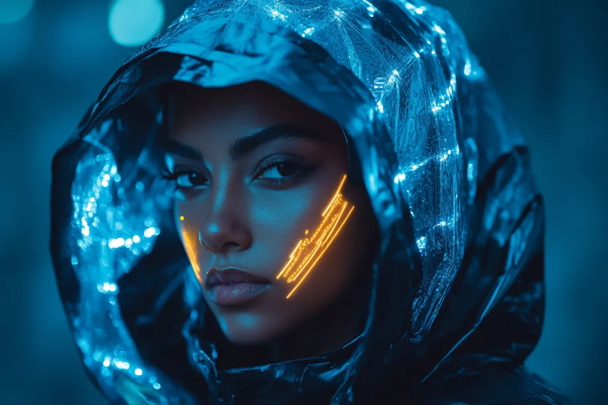 High-tech, LED-infused urban fashion inspired by neon-drenched dystopias.