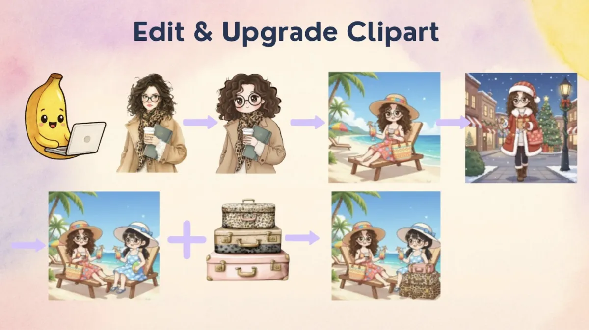 Instantly edit clipart into new styles (watercolor, kawaii, coloring book, and many more.)