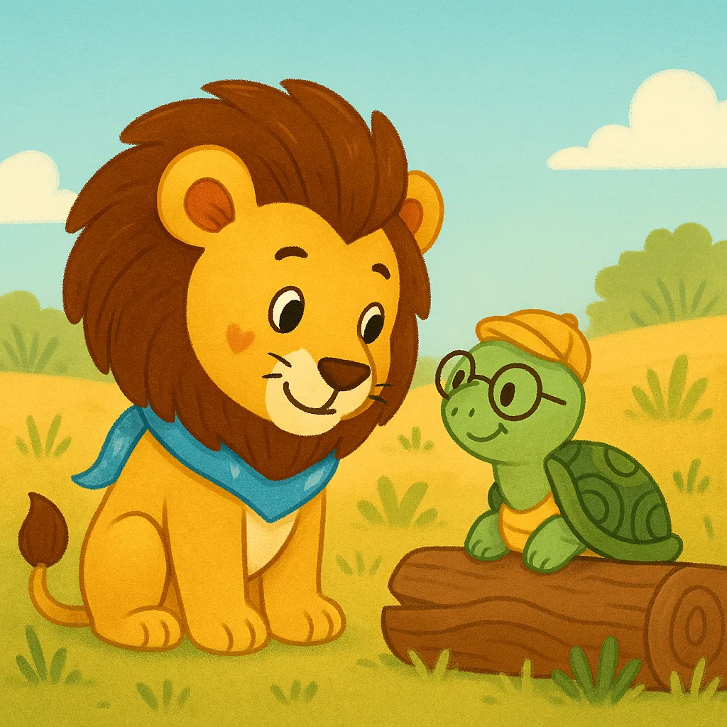 A mighty lion learning that quiet moments create the strongest friendships, even with turtles