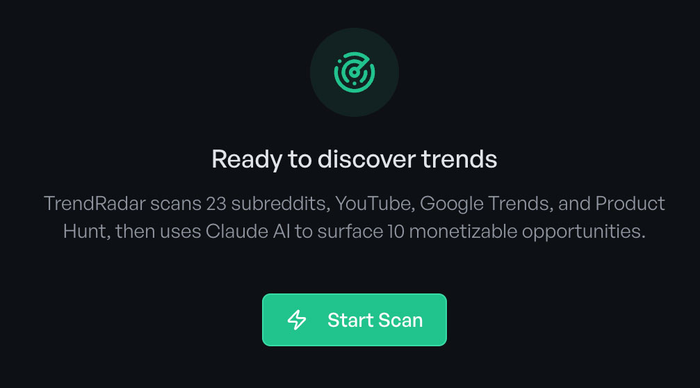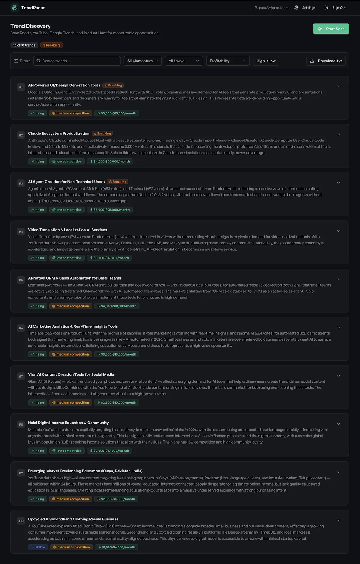At the end of the five days of launch I will move Trend Radar to a monthly subscription model, because frankly, a tool that delivers unlimited trend research across 35+ sources with full action plans is worth a recurring fee.